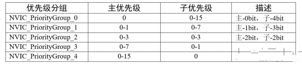 优先级的分组由内核外设 SCB 的应用程序中断及复位控制寄存器 AIRCR 的 PRIGROUP[10:8] 位 决定,F103 分为了 5 组,具体如下:主优先级 = 抢占优先级。