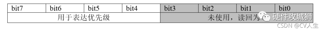 在 NVIC 有一个专门的寄存器:中断优先级寄存器 NVIC_IPRx,用来配置外部中断的优先级,IPR 宽度为 8bit,原则上每个外部中断可配置的优先级为 0~255,数值越小,优先级越高。但是绝大多数 CM3 芯片都会精简设计,以致实际上支持的优先级数减少,在 F103 中,只使用了高 4bit,用于表达优先级的这 4bit,又被分组成抢占优先级和子优先级。如果有多个中断同时响应,抢占 优先级高的就会抢占抢占优先级低的优先得到执行,如果抢占优先级相同,就比较子优先级。如果抢占优先级和子优先级都相同的话,就比较他们的硬件中断编号,编号越小,优先级越高。