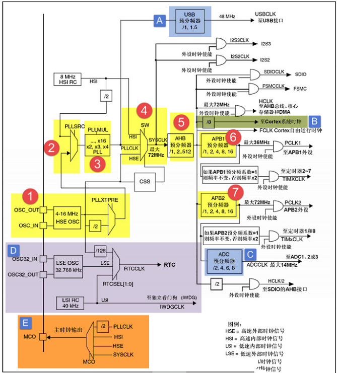 RCC时钟的主要作用:设置系统时钟 SYSCLK 、设置 AHB 分频因子(决定 HCLK 等于多少)、设置 APB2 分频因子(决定 PCLK2 等于多少)、设置 APB1 分频因子(决定 PCLK1 等于多少)、设置各个外设的分频因子;控制 AHB 、 APB2 和 APB1 这三条总线时钟的开启、控制每个外设的时钟的开启。对于 SYSCLK、HCLK、PCLK2、PCLK1 这四个时钟的配置一般是:PCLK2 = HCLK = SYSCLK=PLLCLK = 72M, PCLK1=HCLK/2 = 36M。(以stm32f103vet6为例)