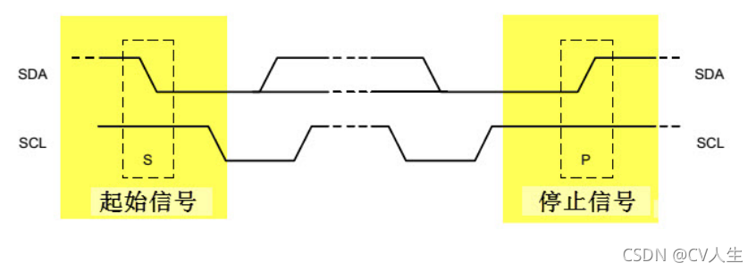 当 SCL 线是高电平时 SDA 线从高电平向低电平切换,这个情况表示通讯的起始。当 SCL 是高电平时 SDA 线由低电平向高电平切换,表示通讯的停止。起始和停止信号一般由主机产生。