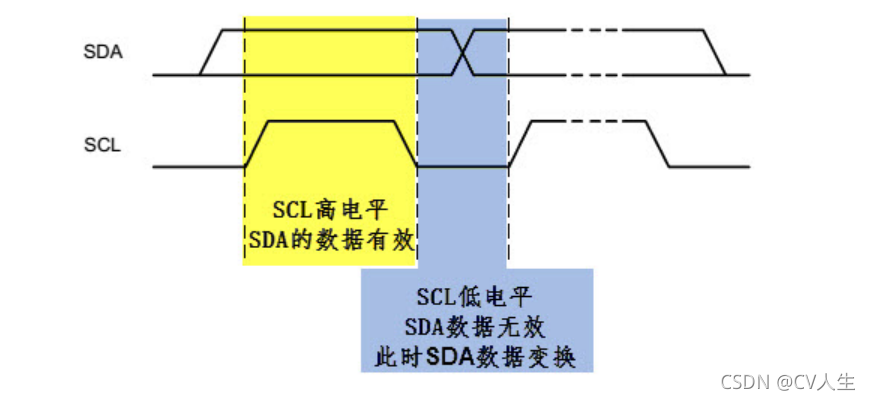 SDA 数据线在 SCL 的每个时钟周期传输一位数据。传输时,SCL 为高电平的时候 SDA 表示的数据有效,即此时的 SDA 为高电平时表示数据“1”,为低电平时表示数据“0”。当 SCL 为低电平时,SDA的数据无效,一般在这个时候 SDA 进行电平切换,为下一次表示数据做好准备。