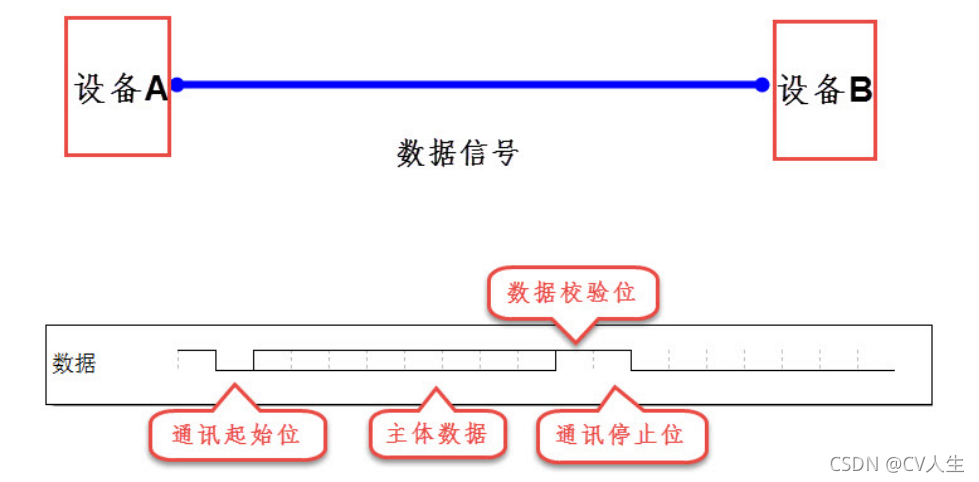 在异步通讯中不使用时钟信号进行数据同步,它们直接在数据信号中穿插一些同步用的信号位, 或者把主体数据进行打包,以数据帧的格式传输数据,见图某种异步通讯 ,某些通讯中还需要双方约定数据的传输速率,以便更好地同步。