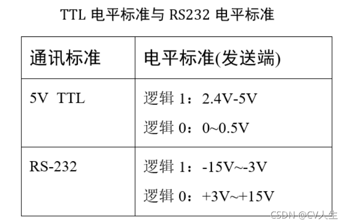 TTL 的电平标准,理想状态下,使用 5V 表示二进制逻辑 1,使用 0V 表示逻辑 0;而为了增加串口通讯的远距离传输及抗干扰能力,它使用-15V 表示逻辑 1,+15V 表示逻辑 0,即RS232。