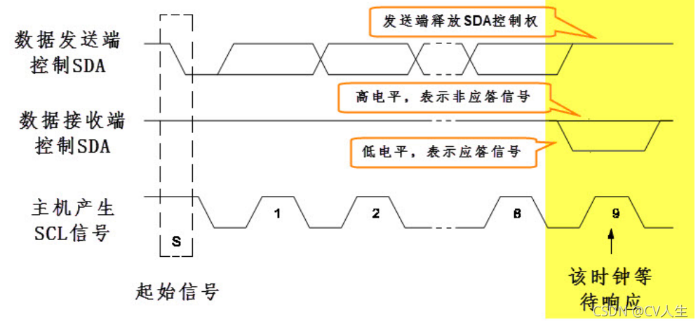 传输时主机产生时钟,在第 9 个时钟时,数据发送端会释放 SDA 的控制权,由数据接收端控制 SDA,若 SDA 为高电平,表示非应答信号 (NACK),低电平表示应答信号 (ACK)。