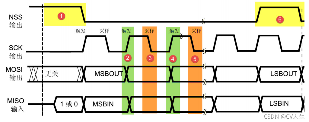 NSS 信号线由高变低,是 SPI 通讯的起始信号。NSS 是每个从机各自独占的信号线,当从机在自己的 NSS 线检测到起始信号后,就知道自己被主机选中了,开始准备与主机通讯。NSS 信号由低变高,是 SPI 通讯的停止信号,表示本次通讯结束,从机的选中状态被取消。