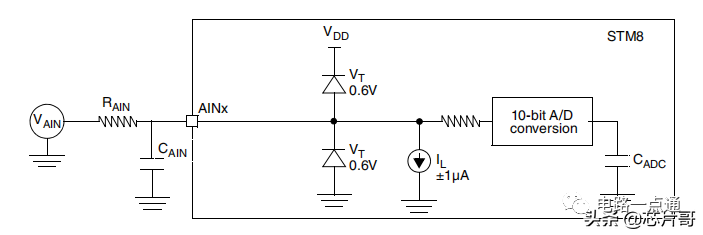 3.1 单片机的IO引脚保护:如外部输入单片机内部的模拟量信号,为了防止模拟量信号过压冲击IO引脚内部电路,需要引入二极管的钳位保护电路;如果单片机内部已集成此保护电路,则可以直接省去;