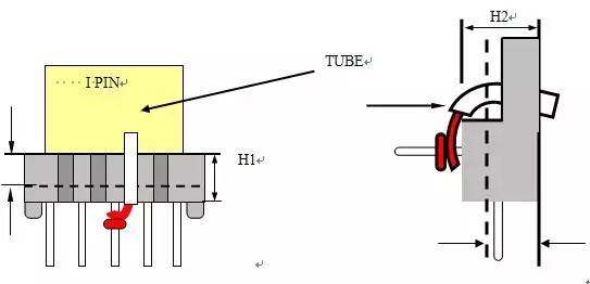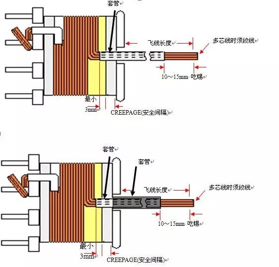 绕法:PIN端6mm/4.8mm/4.4mm/4mm;TOP端3mm/2.4mm/2.2mm/2mm 时不须套管。绕线时铜线不可上档墙,若有套管,套管必须伸入档墙3mm以上。