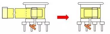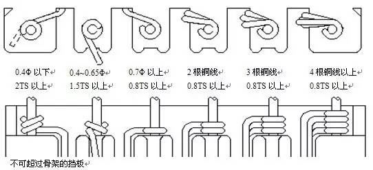 ②出入线于使用,骨架的凹槽出线时,原则上以一线一凹槽方式出线,若同一引脚有多组可使用同一凹槽或相邻的凹槽出线,唯在焊锡及装套管时要注意避免短路。