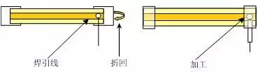 ①内铜箔一般加工方法:焊接引线→铜箔两端平贴于醋酸布中央→折回醋酸布(醋酸布须完全覆盖住焊点)→剪断醋酸布(铜箔两边须留1mm以上),如图8所示。