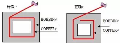 1)铜箔绕法除焊点处必须压平外铜箔之起绕边应避免压在骨架转角处,须自骨架的中央处起绕,以防止第二层铜箔与第一层间因挤压刺破胶布而形成短路,如图11所示。
