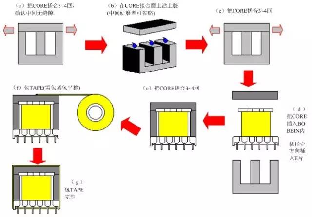 4)铁心固定方式可以铁夹(CLIP)或三层胶布方式固定,且可在铁心接合处点环氧树脂胶(EPOXY)固定,点胶后须阴干半小时再置于120℃烤箱中烘烤一小时。包铁心的固定胶布须使用与线包颜色相同的胶布(图面特殊要求除外),厂家需符合UL规格。组装过程如图21所示。